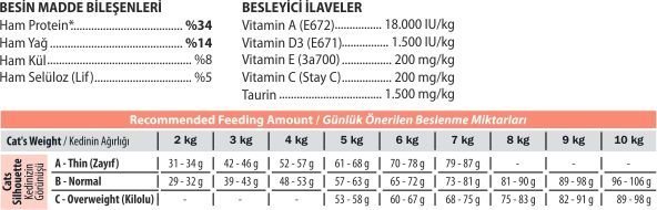 İÇİNDEKİLER: İşlenmiş Somon Proteini, İşlenmiş Hayvansal Protein, Mısır, Tavuk Yağı, Pirinç, Şeker Kamışı Lifi, Şeker Pancarı, Balık Aroması, Vitaminler ve Mineraller, Somon Yağı, Ksilo-Oligosakkarit, Bira Mayası, Karnabahar Lifi (Psyllium), Tuz, Yucca Schidigera, L-Karnitin, Koruyucular - Antioksidanlar.