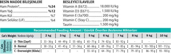 İÇİNDEKİLER: İşlenmiş Tavuk Proteini, Mısır, Tavuk Yağı, Pirinç, Şeker Kamışı Lifi, Şeker Pancarı, Ciğer Aroması, Vitaminler ve Mineraller, Keten Tohumu, Ksilo-Oligosakkarit, Bira Mayası, Tuz, Yucca Schidigera, L-Karnitin, Koruyucular - Antioksidanlar.