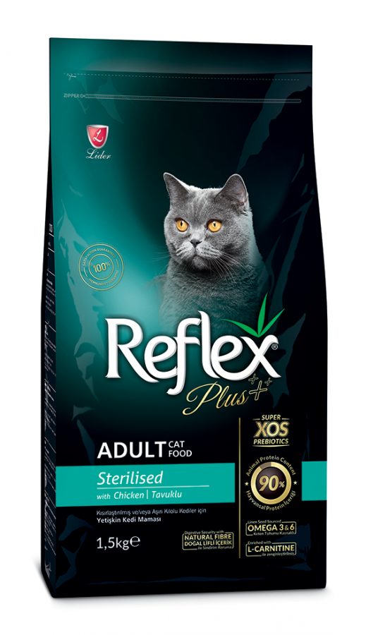 REFLEX PLUS ADULT CAT STERILISED CHICKEN(TAVUKLU);12 aylıktan büyük, kısırlaştırılmış ve/veya aşırı kilolu ve aktif olmayan kediler için tam ve dengeli formüle edilmiş, tavuklu, süper premium kuru kedi mamasıdır.
