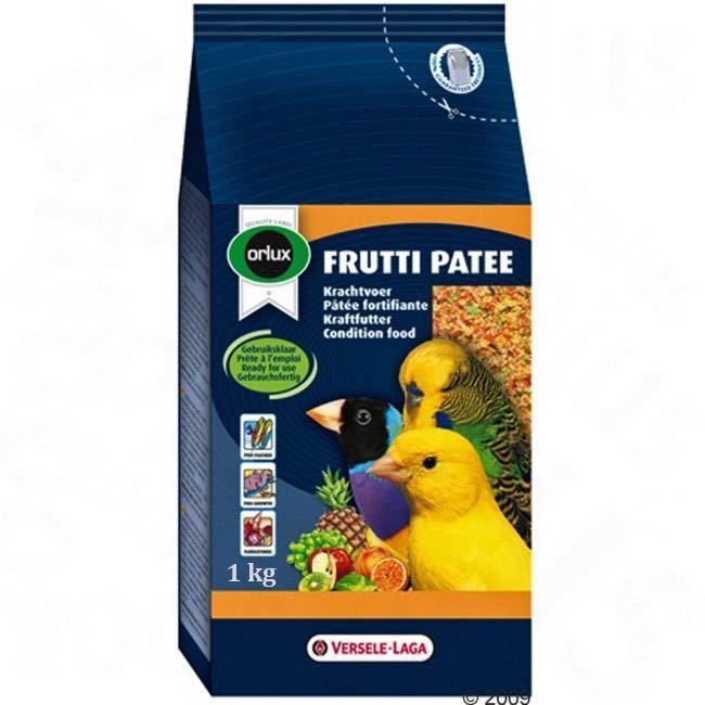 Orlux Frutti Patee kanaryalarınız, tropik finchleriniz ve ufak paraket kuşlarınız için, ekstra enerji sağlayan, oldukça renkli bir yemdir. Frutti Patee'nin içeriğinde kurutulmuş yemler bulunmaktadır.